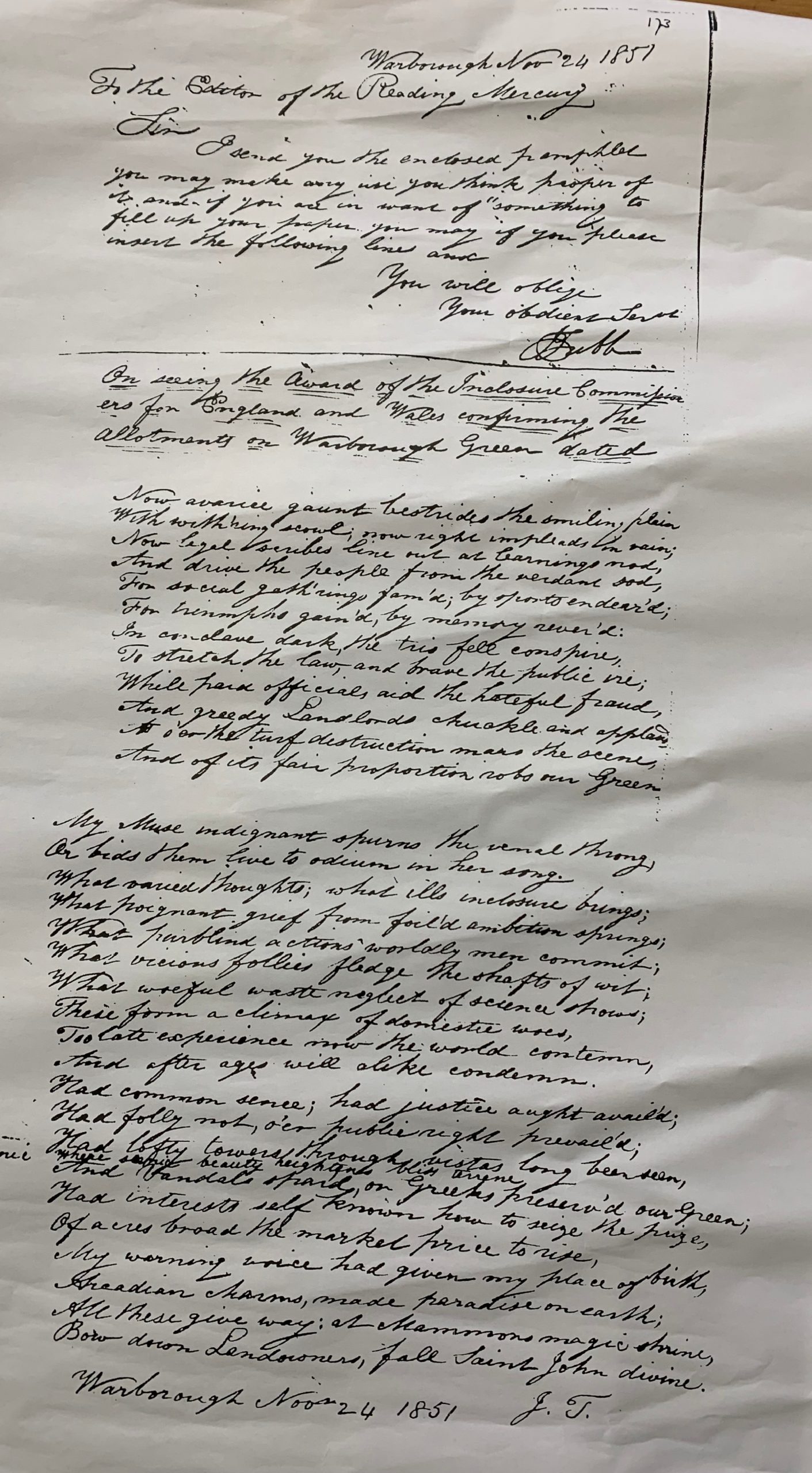 On seeing the award by the Inclosure Commissioners for England and Wales confirming the Allotments on Warborough he wrote to the Reading Mercury, in poem form on 24th November 1851