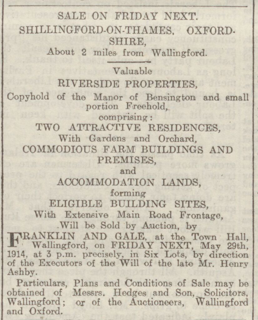 The 1921 census shows Fanny, Frank’s widow with her son Henry living next door to Riverside so presumably still in Old Wharf Farm, she died in 1931 in Berkshire and does not appear to be buried in Warborough.