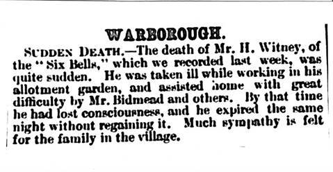 Henry and Ann Witney became tenants of the Six Bells in 1889. His unexpected death in 1906 was reported in the Berks & Oxford Advertiser, 11th May 1906: