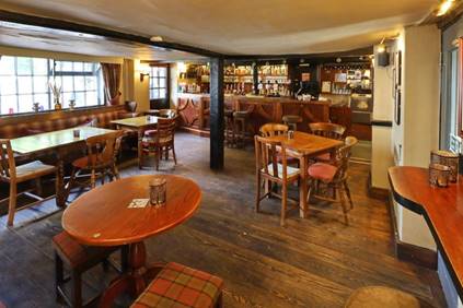 Internally, the bar and kitchen occupy the left-hand side of the building, alongside a small dining area containing an original fireplace. A connecting passage leads to the principal dining room, while a rear garden opens directly from the bar area.