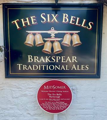 Red plaque outside of the Six Bells referencing Midsomer Murders