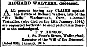 A notably brief tenancy followed under Richard Walters, who took over the Six Bells after David Tull in 1913 and died in January 1914. Aged forty-two. His father, William Walters, was born in Warborough and had previously run the Lion Inn (later called Red Lion) in Wallingford. Richard has worked for his father for several years before taking on the Six Bells with his wife, Elvina Amelia Pike. His probate notice reads: