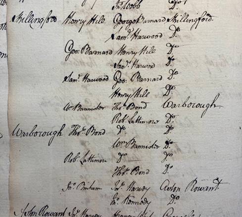 From 1552 onwards, local justices of the peace were empowered to issue licences for the sale of ‘beer and tipples’ (spirits). Publicans were required to nominate two sureties, who acted as guarantors of the licensees good character. These sureties could forfeit their bond if a publican was charged with misconduct. This might include disorderly behaviour, illegal gaming (such as quoits, bowls, cards, dice, football or tennis) or opening outside permitted hours. Extracts from the Victuallers’ Licences of the Watlington Petty Sessions, and records held within the Oxfordshire History Centre, reveal that many publicans within the Parish stood surety for each other. The exception to the list below is John Binham, who had recently moved from Aston Rowant, and had taken over the Six Bells. Both of his sureties were also from Aston Rowant.