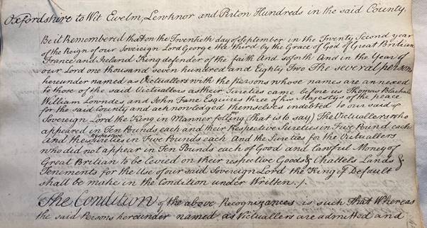 Extract from 1782 Victuallers Licenced giving conditions for sureties